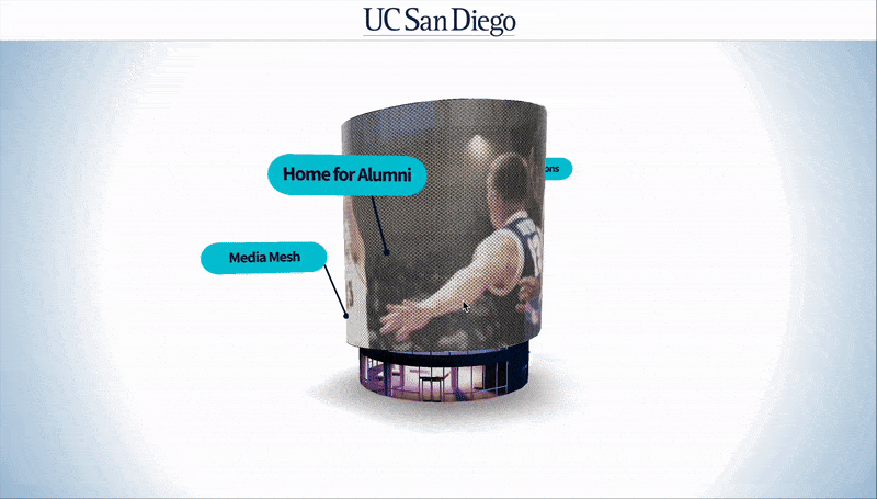 Web XR: UCSD created an interactive 3D model of the Triton Center accessible directly from any web browser. Users could click a link to explore the model on their devices, rotating and zooming in on different areas of the project. Interactive pop-ups provided detailed descriptions of the alumni center's purpose and features. This experience can be integrated into the project’s website, shared on social media, and displayed on screens around the campus, giving everyone a virtual tour of the new development.